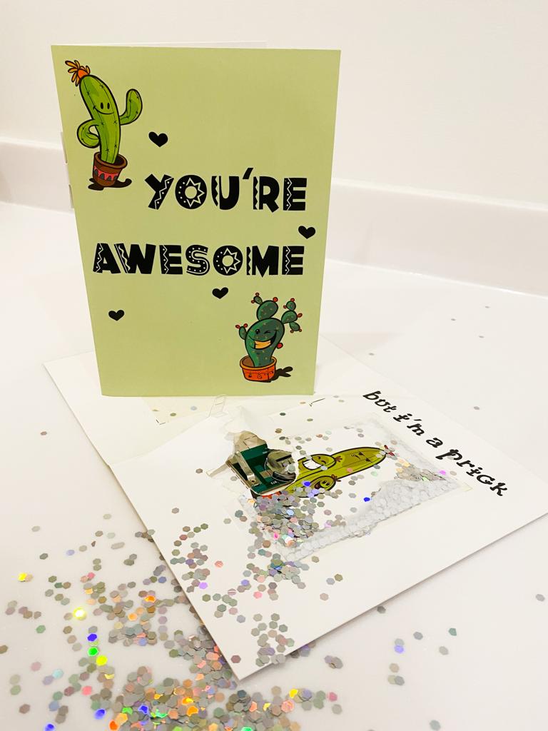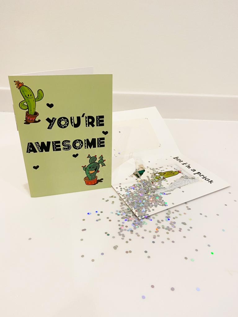 This card is no ordinary greeting card. Our ‘You’re Awesome’ Glitter Bomb Card is a double edged sword. On first impressions, it looks like an innocent and complimentary card.